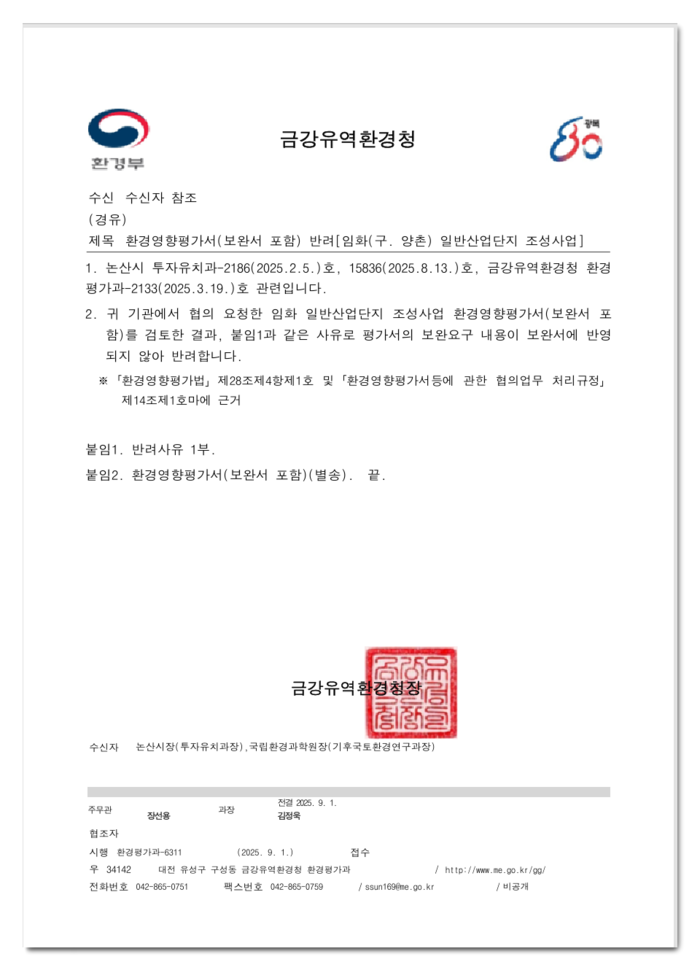 논산시와 KDI의 양촌일반산업단지 추진과정에서 금강유역환경청은 환경영향평가서에 대해 보완을 요구했고, 이후 최종 '반려' 결정을 내렸다. 이 내용을 시민들이 접하게 되면서 갈등의 핵심 변곡점이 되었다.