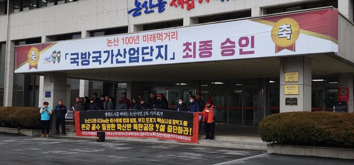 2024년 2월 6일 시민대책위원회가 “논산시가 주민을 속였다”며 논산시청 앞에서 기자회견을 열고 “확산탄 공장 건설 중단”을 요구했다. 이어 같은 달 29일, 논산시의회는 제252회 임시회에서 ‘비인도적 대량살상무기 생산업체(KDI) 논산 입주 반대 청원의 건’을 원안 가결했다. 여기서부터 논란은 더 이상 “양촌의 일부 주민 민원”이 아니게 된다. 시민사회와 의회가 공식적으로 문제를 제기하면서 사안은 지역 정치의 전면으로 올라섰고, 동시에 전국적 이슈(집속탄, 확산탄, 비인도적 무기 논쟁)와 연결되기 시작했다.