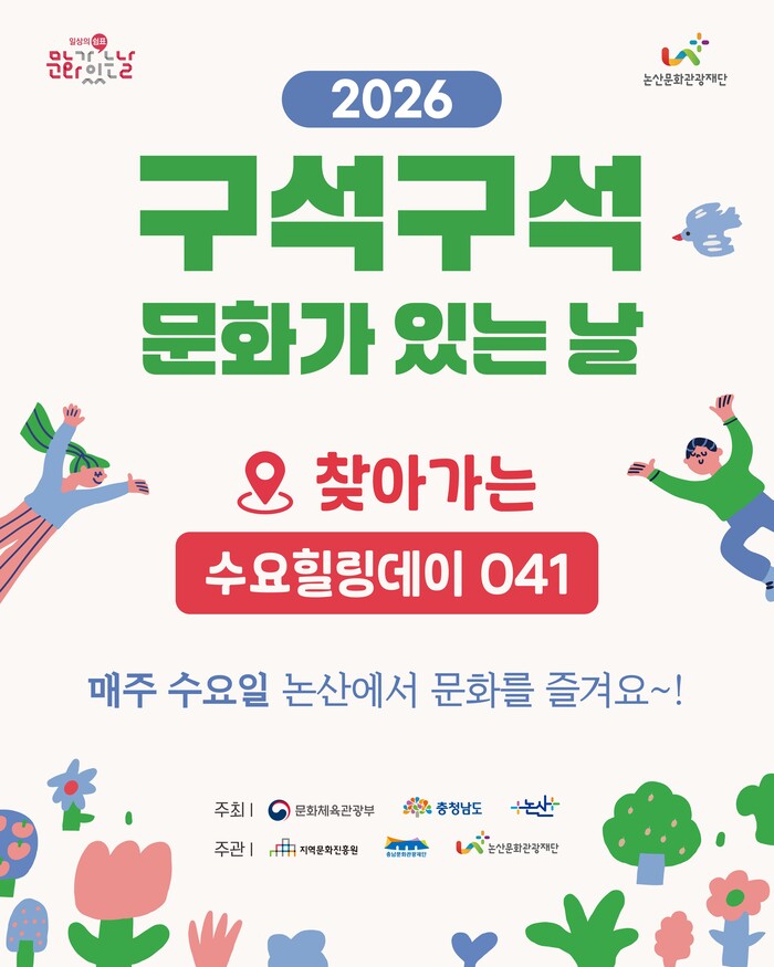 (재)논산문화관광재단이 문화체육관광부가 주최하고 지역문화진흥원이 주관하는 ‘구석구석 문화가 있는 날’ 사업에 선정돼 ‘찾아가는 수요힐링데이 041-논산’을 본격 운영한다.