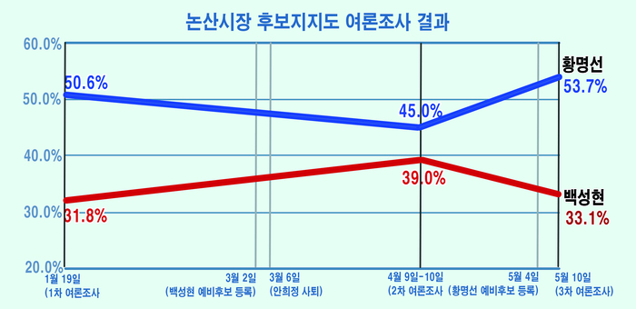 반면 4월 27일 판문점 선언과 5월 4일 황명선 예비후보의 등록으로 다시 두 후보의 격차가 벌어지는 형국을 나타내고 있다.