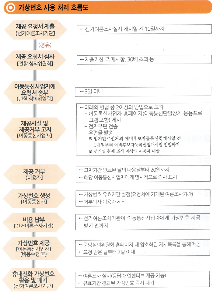 2016년 4.13총선에서 처음 도입된 휴대전화 가상번호(안심번호)는 이용자의 이동전화번호가 노출되지 않도록 여론조사에 사용할 전화번호를 가상의 전화번호(050-0000-0000) 형태로 변환하여 제공하는 것으로, 여론조사 응답자의 개인정보 노출 없이 지역별 성별 연령대별로 대표성을 확보하여 여론조사결과의 신뢰성을 제고하기 위하여 도입된 제도이다.