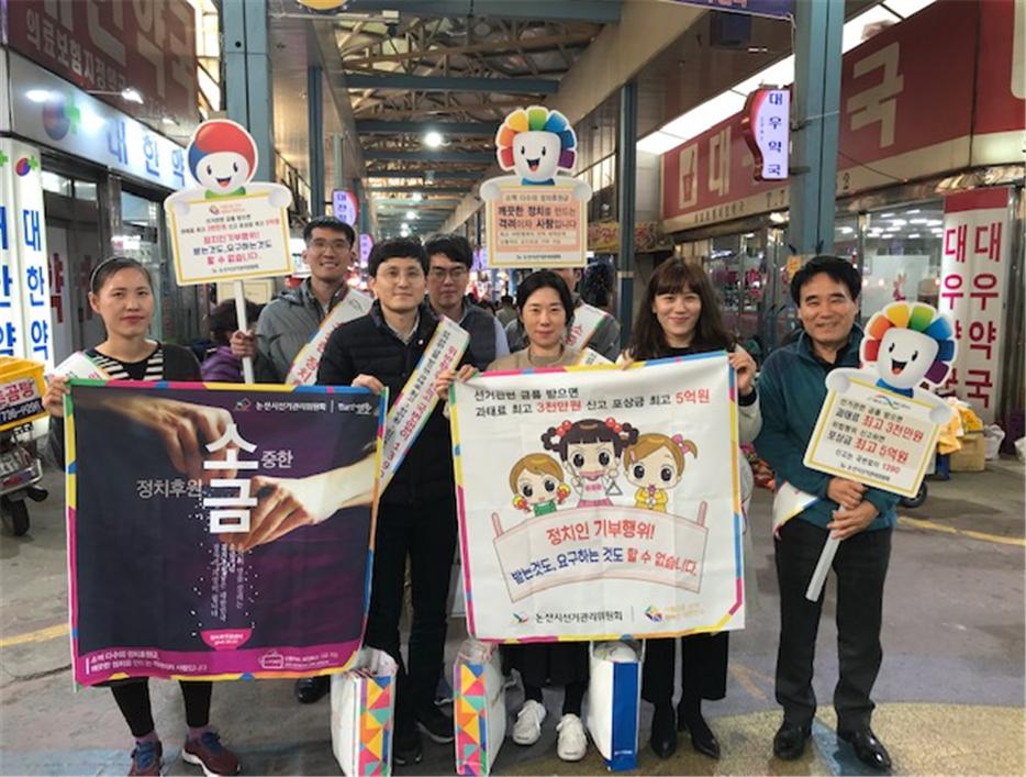 계룡시선거관리위원회는 11월 7일 제18회 팥거리축제가 진행된 새터산공원에서, 논산시선거관리위원회는 8일 화지중앙시장에서 지역주민을 대상으로 ‘기부행위 상시제한 및 정치자금 후원’ 캠페인을 전개했다. 캠페인에서 정치자금 후원의 필요성, 모바일 등 편리한 기부방법 및 세액공제혜택 등에 대한 안내와 정치인 등의 축·부의금 등 금품기부 관련 제한행위, 과태료·포상금제도 등에 대한 홍보를 중점적으로 실시하였다. 선관위 관계자는 “깨끗한 선거문화에 유권자들이 동참할 수 있도록 다양한 기회를 통해 시민들을 만나 공명선거 분위기 조성을 위해 노력할 것”이라고 밝혔다.