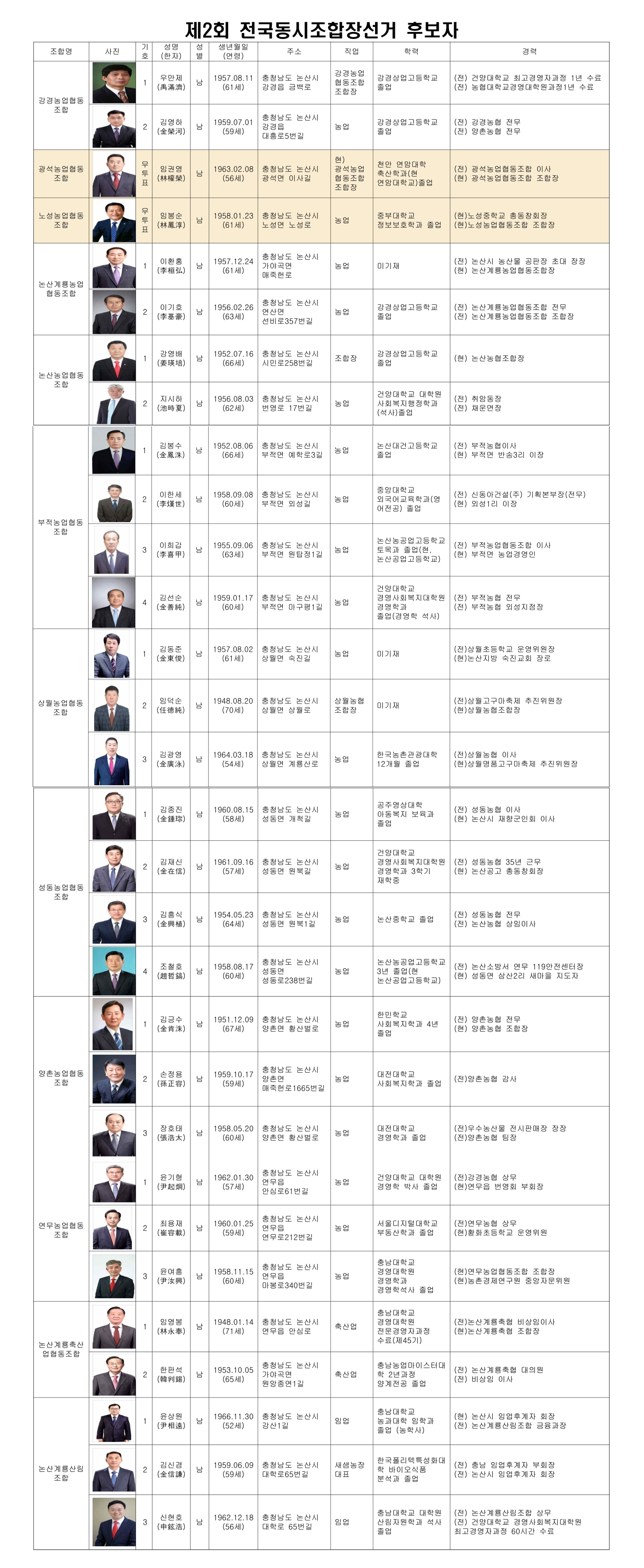 논산시선거관리위원회(위원장 박헌행, 이하 논산선관위)는 2019년 3월 13일 실시하는 제2회 전국동시조합장선거와 관련하여 2월26일~27일 양일 간 후보자등록 신청을 받은 결과 총 30명이 후보자등록 신청을 마쳤다고 밝혔다. 논산선관위는 2월 27일 후보자 등록을 완료한 후보자들을 대상으로 제2회 전국동시조합장선거가 돈 선거, 비방․흑색선전 등 과거의 잘못된 관행을 벗어나 법규를 준수하며 금품없는 깨끗하고 아름다운 선거가 될 수 있도록 ‘매니페스토 정책선거 실천 협약식’을 개최하였다. 논산선관위는 조합장선거와 관련하여 후보자 등의 금품․음식물 제공, 허위사실·비방 등 불법 선거운동을 목격할 경우에는 즉시 논산선관위(☏733-1390)로 신고․제보하여 줄 것을 당부하였다.