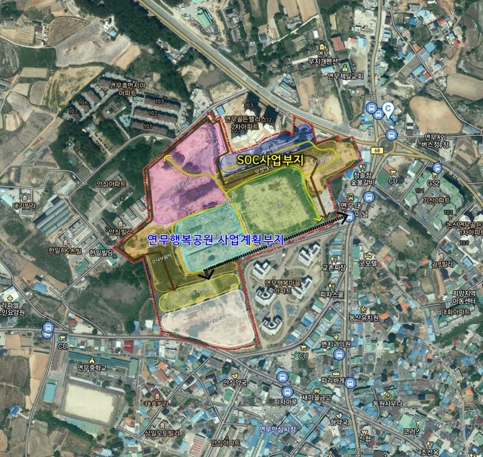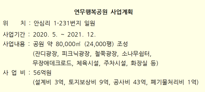 “중복 예산 반납하며 지속적 검토” 논산시는 국방부에서 매각 직전이던 기산아파트 인근 ‘기무사 부지’를 충청시설단과 협의하여 연무공원을 조성한 전례를 갖고 있다. ‘군(軍)이라는 특수성을 감안한다면 사전에 떠벌린다고 일이 성사되는 것이 아님’을 전제하면서 “충분한 준비와 집중력있는 설득이 업무의 주요 관건”이라고 연무공원 조성을 담당했던 관계자는 조언한다. 논산시는 연무행복마을 입구 안심리 1125-18번지 일원 15,380㎡에 준비 중이던 연무행복마을쉼터 3억5천만여 원의 예산을 반납했다. 이는 연무행복공원과 사업이 중복되는 것을 방지하기 위함이다. 연무행복마을 인근 국방부 부지에 대한 공원 조성 사업은 여러 각도로 꾸준히 검토되고 있었던 사안이다.