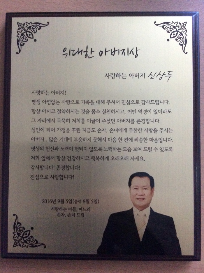 신상두(申相斗) 계룡더샵아파트 노인회 총무는 올해 75세이다. 그의 고향은 충남 연기군(지금의 세종시) 금남면 감성리이다. 그의 집안은 그곳에서 대대로 농사를 지어온 양반가였다. 그의 부친은 3형제 중 둘째였는데, 일제강점기 때 형 대신 보국대(징용)에 들어가 12년 간 동남아 일대에서 노역을 했다. 당신께서 그런 결정을 내렸다기보다는, 아마 집안의 장자를 사지로 보낼 수 없었기에 둘째를 대신 보내기로 한 부모님의 결정에 따른 것이었으리라. 그의 부친은 그런 분이셨다. 그의 부친이 징용에 가기 전 서둘러 혼인을 하였는데, 그때 그의 모친 나이는 열여섯이었다. 그의 모친은 언제 돌아올지 모르는 남편을 기다리며 무려 12년 동안 시집살이를 했다. 그런 깊고 고운 심성을 가지신 부친과 모친 사이에서 6남매 중 장남으로 태어났다.