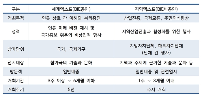 [BIE 비공인 엑스포] 세계박람회는 BIE 공인 엑스포와 비공인 엑스포로 구분된다. 비공인 엑스포는 인류 발전에 기여할 수 있는 미래 비전을 제시하는 BIE 공인 엑스포와 달리 대부분 상품 판매 등으로 인한 이익을 추구하며, 전시 과정에서도 한국관, 일본관 같은 국가관 명칭을 쓸 수 없고, 초청 주최 역시 공인 엑스포가 정부인데 비해 비공인은 주최 도시 또는 기관이다. 이천세계도자기엑스포, 경주세계문화엑스포, 고양세계꽃박람회 등은 모두 엑스포라는 명칭을 붙이기는 했으나 BIE의 공인을 받지 못한 엑스포이다.