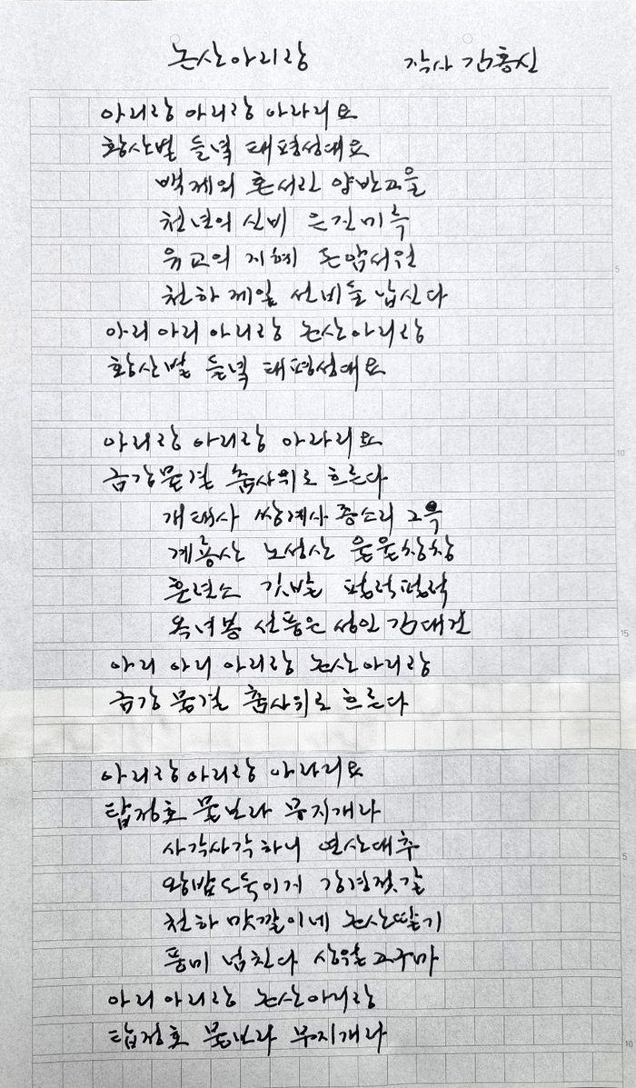 시(詩)가 한 소절씩 노래가 되면 참 맛깔스럽습니다. 흥겨운 가락에 절로 너른 춤사위가 흐드러집니다. 아리랑의 작시·작사·작곡은 어깨춤 들썩이는 작업이지만, 지정학적인 생태환경과 역사, 시류, 민의 등 제반 요소를 한데 모아 불가마에 쇳물 녹여내는 작업이기도 합니다. 논산 하면 떠오르는 게 참 많습니다. 대한민국 국민이라면 먼저 연무대 훈련소를 꼽습니다. 관심사에 따라서 은진미륵, 탑정호 출렁다리, 선샤인랜드 같은 명소를 거명하기도 합니다. 강경젓갈, 논산딸기처럼 축제 이미지가 떠오르는 경우도 흔합니다. 그러나 논산은 조선의 걸출한 대선비들의 정신사가 깃든 곳이요, 예학의 기둥이며 스승의날 발원지요 충절의 대들보이자 깨달음의 반석이기도 합니다.
