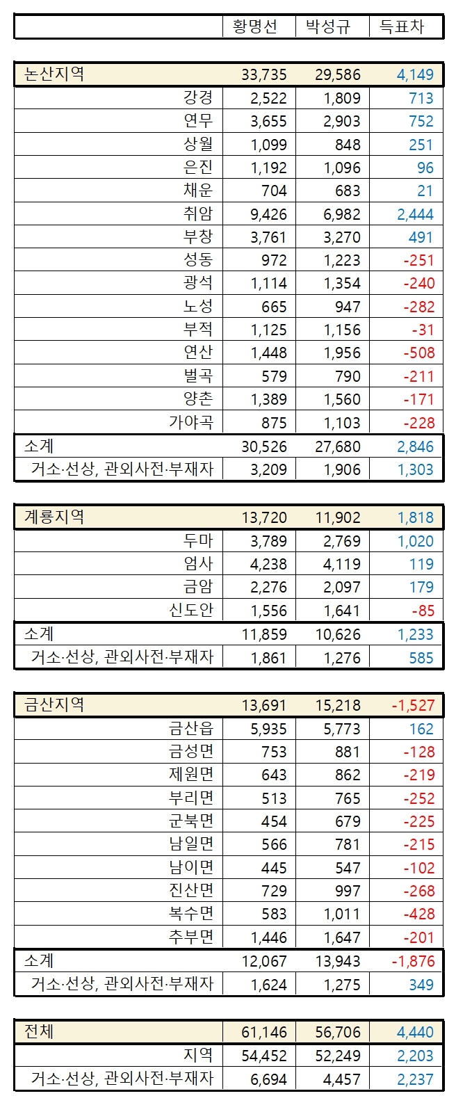 두 후보의 득표현황을 살펴보면, 황명선 후보는 시내권에서 박성규 후보는 외곽권에서 각각 강세를 보였다. 논산 지역을 살펴보면 황명선 후보는 강경, 연무, 상월, 은진, 채운, 취암, 부창에서 앞섰으며, 박성규 후보는 성동, 광석, 노성, 부적, 연산, 벌곡, 양촌, 가야곡에서 더 많은 득표를 받았다. 계룡 지역에서는 황명선 후보가 두마, 엄사, 금암에서 앞선 반면, 박성규 후보는 신도안에서만 우세를 보였다. 금산 지역에서는 박성규 후보가 선전했다. 금산읍을 제외한 전 지역에서 박성규 후보가 황명선 후보를 앞서는 결과가 나타났다. 그런데 무엇보다도 황명선 후보에게 승리를 안겨준 가장 큰 원인은 ‘거소‧선상투표’, ‘관외사전투표’, ‘국외부재자투표’이다. 황명선 후보가 박성규 후보보다 2,237표를 더 확보해 전체 표 차이 4,440표의 과반을 차지하는 결과를 토출했다.