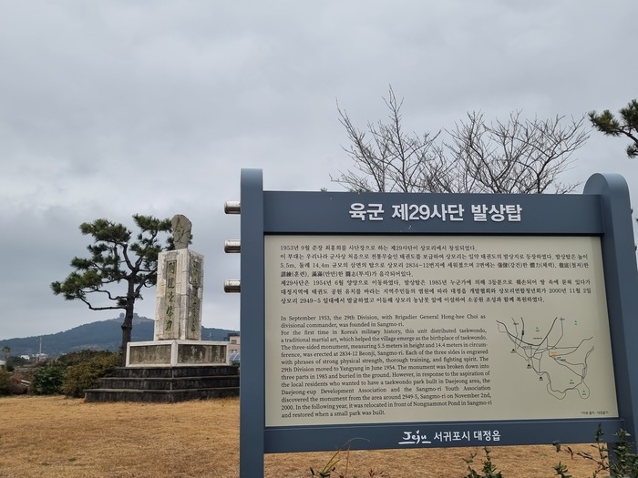 최홍희는 함경북도 명천 출신으로 14세부터 서예와 택견을 배웠다. 일본 중앙대학 전문법학과를 졸업한 그는 1943년 가라데에 입문하여 2단 정도의 기량을 익혔다. 1944년 1월 징용되어 조선학병을 중심으로 전국 반일동맹을 조직하다가 검거돼 6년형을 선고받아 평양형무소에서 복역 중 해방을 맞았다. 해방 후 서울에서 국군창설요원의 영어군사학교를 수료하고 1953년 9월 모슬포에서 제29사단인 일명 익크부대를 창설하여 사단장을 역임했다. 1954년 말경 태권도라는 명칭을 창안한 그는 당시 일부 군대를 중심으로 태권도라는 명칭이 쓰이도록 기반 조성에 나섰으며, 1958년 대한태권도협회를, 1966년 국제태권도연맹을 창립한 후 총재로 취임했다. 1972년 3월 캐나다로 망명한 그는 박정희의 유신체제 반대운동을 펼치며 북한을 여러 차례 방문했고, 1980년 10월 평양체육관에서 태권도 시범을 보였다. 2002년 6월 그가 여러 차례 방문했던 평양에서 사망한 후 혁명열사릉에 안장되었다. 태권도의 발상지임을 웅변하는 주먹탑은 높이 5.5m, 둘레 14m로, 삼각기둥 모양의 각면에‘건강한 체력·철저한 훈련·만만한 투지’라는 구호가 새겨져 있다. 맨 위에는 한반도 모양의 도안 속에 오른손 주먹을 그려 넣은 돌을 세웠었다. 1985년 11월 주먹탑이 사라졌다가 2000년 11월 대정읍 개발협회에서 대정 지역이 태권도 발상지라는 역사성을 살리기 위해 탑을 복원하기로 하고 탑 매몰 추정지인 상모리 2849-5번지 일대를 발굴하여 29사단 주먹탑을 찾아냈다. 발굴 당시 탑은 세 동강이 났고, 글씨도 심하게 훼손됐다. 2006년 7월 발간된 제주태권도 50년사에는 모슬포 29사단이 제주 태권도와는 관련이 없다는 다음의 글이 실렸다. “1953년 9월 모슬포에 창설된 육군 제29사단(사단장 최홍희) 일명 익크사단에서 장병들의 기초체력 단련과 호국무술로서 태권도를 했다는 기록이 있다. 제29사단에서 행한 것은 군대조직 내에서 훈련과정으로 행해진 것으로, 민간인들에게는 영향력이 없어 제주 태권도와는 연관성이 없는 것으로 판단된다.”