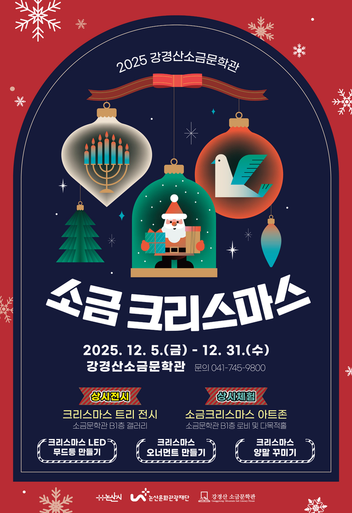 (재)논산문화관광재단(이사장 백성현)이 운영하는 강경산 소금문학관이 크리스마스를 앞두고 관람객들에게 따뜻한 연말 정취를 선사할 특별 전시와 문화예술 체험 프로그램을 선보인다.