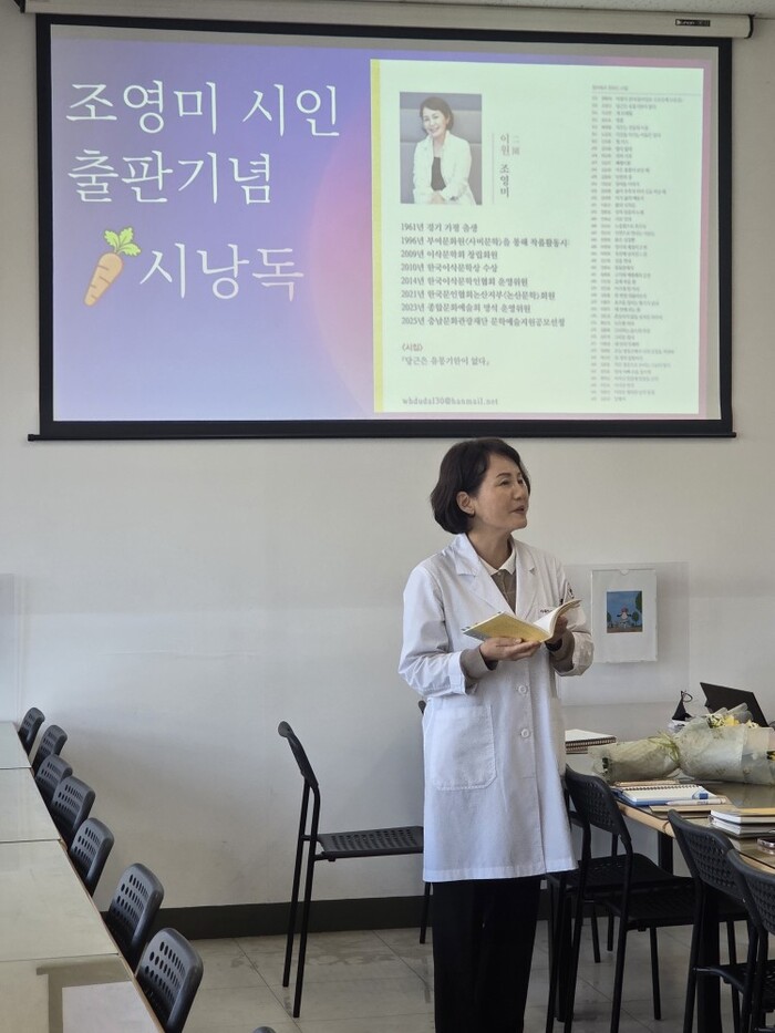 조영미 시인이 논산논산문인협회에 가입한 때는 5년 전이다. 이번 시집은 충남문화관광재단 문학예술지원공모 선정으로 빛을 보았다. 조 시인은 30년 전 부여문화원 사비문학을 인연으로 시에 입문한 이래 부여는 물론 충주시 종합문화예술회나 논산문학회에서 활동을 이어왔다. 2025년 논산문인협회는 김홍신문학관에서 모임을 자주 가졌다. 이때 조 시인은 대부분 참석했지만 조용조용 눈에 잘 띄지 않는 편이었다.