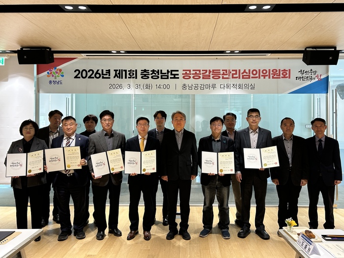충남도는 3월 31일 충남공감마루에서 ‘2026년 제1회 공공갈등관리심의위원회’를 개최하고 제8기 위원회 민간위원 위촉과 운영 방향을 논의했다.