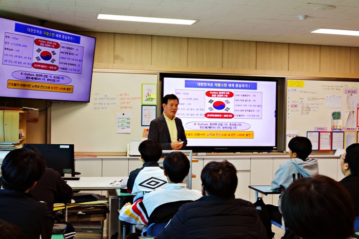 이어 대한민국의 국가 경쟁력에 대해 설명하며 국방력과 방위산업, 반도체·AI·IT 산업, 조선업 등 세계적 수준의 산업 발전을 소개했다. 특히 K-문화와 스포츠 분야에 대한 내용에서는 학생들의 반응이 뜨거웠다. BTS의 세계적 활약과 올림픽 영상이 상영되자 교실 곳곳에서 환호가 터져 나왔으며, 문화 강국으로서 대한민국의 위상에 대한 자긍심을 높였다.
