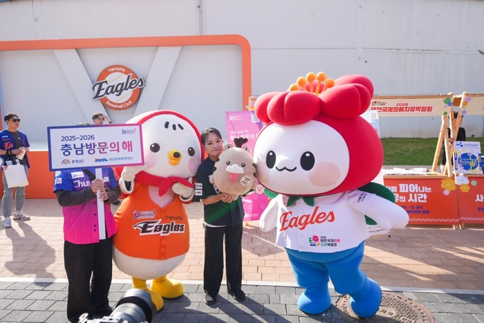 이날 야구장 외부 광장에는 총 7개의 홍보관이 설치돼 관람객들의 발길을 끌었다. 각 부스에서는 △‘충남 여행가는 달’ 및 방문의 해 △‘꽃처럼 피어나는 치유의 시간’ 태안국제원예치유박람회 △‘움직이는 섬: 사건의 수평선을 넘어’ 2027 섬비엔날레 △2026 천안 K-컬처 박람회 △천안 ‘빵빵데이’ △아산 성웅 이순신 축제 △예산 방문의 해 등 도내 대표 관광 콘텐츠를 연계해 소개했다.