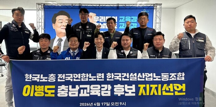 건설산업노조는 선언문을 통해 “건설 현장에서 땀 흘리는 노동자들은 아이들의 부모이자 사회의 구성원”이라며 “아이들이 자라날 교육 현장이 단순한 지식 전달을 넘어 ‘사람 대접받는 세상’과 ‘노동의 가치가 빛나는 사회’를 배우는 공간이 되길 바란다”고 밝혔다. 이어 “충남 교육의 미래를 책임질 적임자로 이병도 후보를 지지한다”고 강조했다.