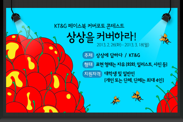 KT&G(사장 민영진)가 ‘페이스북(Facebook) 커버포토 콘테스트’를 개최한다. ‘페이스북 커버포토’란 페이스북 메인화면을 꾸밀 수 있는 사진을 의미한다. 공모 분야는 KT&G 사회·문화 공헌활동을 소재로 한 ‘KT&G리그’와 소재 제한이 없는 ‘MY리그’ 등 2개 부문으로 대학생 및 일반인 누구나 참여 가능하며, 접수 기간은 3월18일까지이다. 최종 수상자 13팀은 3월28일쯤 발표할 예정이며, 총 500만원 상당의 상금 및 아이패드미니 등이 수여된다. 또한 수상작은 KT&G 페이스북의 실제 커버포토로 활용될 예정이다. 심사위원으로는 웹툰 작가 하일권씨를 비롯, 그래픽 디자이너 이에스더씨, 소셜미디어 전문가 이상석씨가 참여한다. 수상자는 참가 작품의 상상력 및 디자인 부분에 대한 심사위원 점수와 자기 작품에 대해 실시한 소셜활동 점수를 합산, 결정하게 된다. KT&G 관계자는 “이번 커버포토 콘테스트가 참가자들이 상상력을 마음껏 발휘하는 상상실현의 장이 되길 기대한다”라고 밝혔다. 접수 및 자세한 사항은 KT&G 페이스북(facebook.com/ktngcorp)을 통해서 확인할 수 있다. /권기택 기자 <저작권자 ⓒ 논산계룡일보 무단전재 및 재배포 금지>